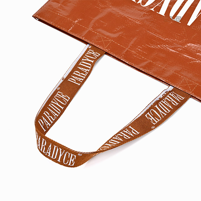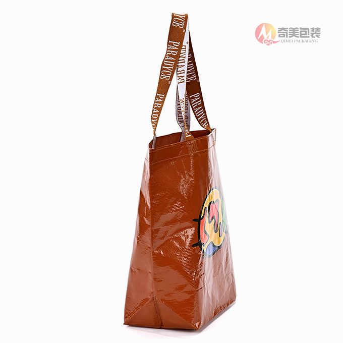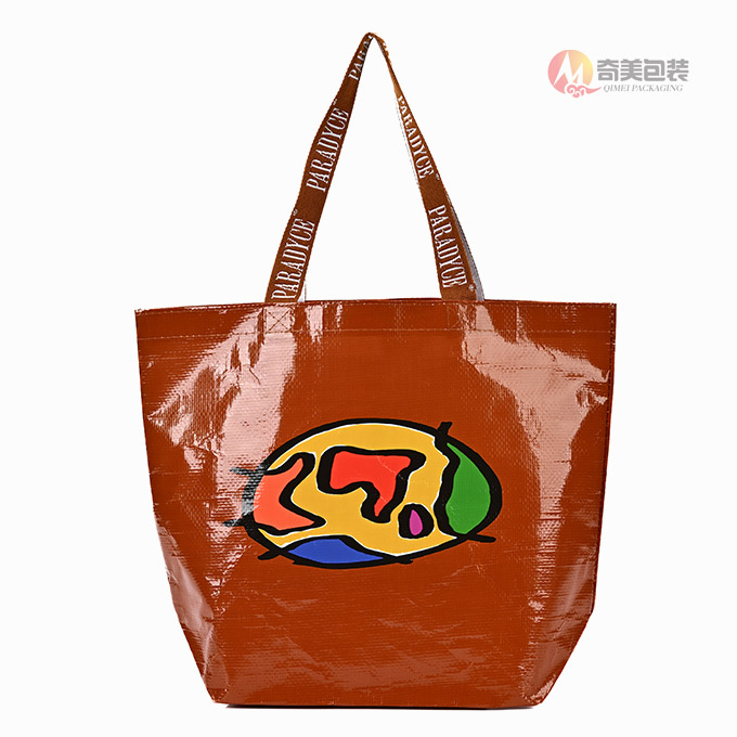This bold, artistic reusable tote bag, expertly crafted by Zhejiang Qimei Packaging Factory, merges streetwear-inspired design with premium durability. Made from high-gloss, tear-resistant laminated PP woven fabric in a rich caramel brown finish, it features a vibrant, retro-style abstract graphic on the front, paired with custom-printed brown webbing handles emblazoned with the “PARADYCE” brand name—showcasing Qimei’s exceptional high-definition, full-color printing and double-sided branding capabilities.