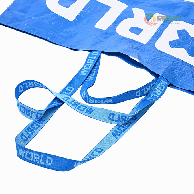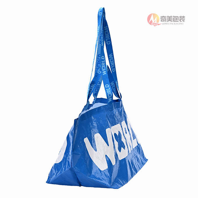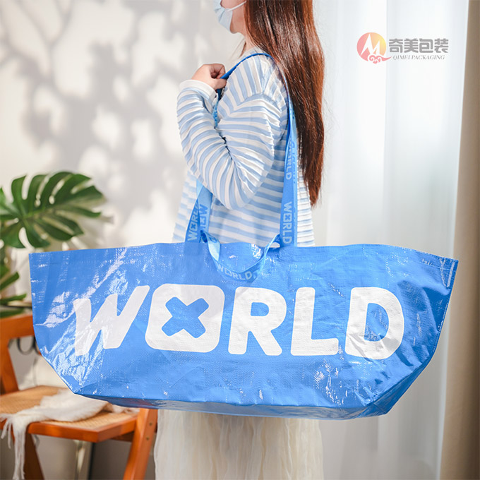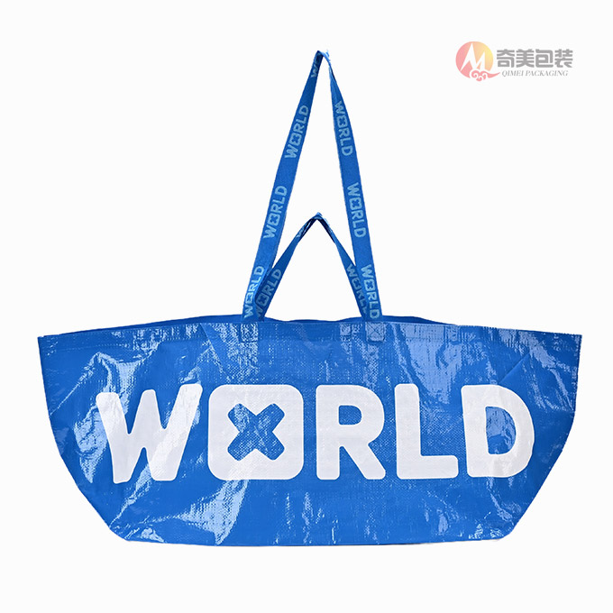 This eye-catching, extra-large reusable tote bag, expertly manufactured by Zhejiang Qimei Packaging Factory, merges modern streetwear aesthetics with uncompromising durability. Crafted from high-gloss, tear-resistant laminated PP woven fabric in a striking bright blue finish, it features a bold, minimalist “WORLD” graphic with a unique cross-shaped “O”—showcasing Qimei’s premium high-definition printing and color contrast capabilities.